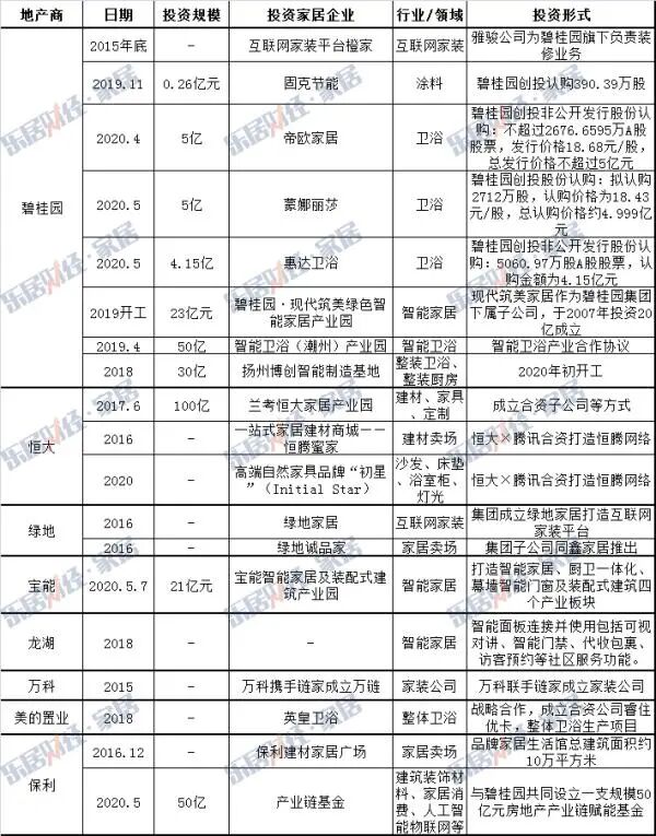 仅2020年初至五月,碧桂园投资15亿元入股三家瓷砖卫浴企业,恒大与腾讯的合资企业推出“初星”家具品牌,保利与碧桂园联合设立50亿元房地产产业链赋能基金辐射家居相关众多领域。2020年,地产商又开始了对家居领域的新一轮加速布局。