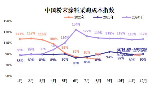 2025年8月粉末涂料采购成本指数为80%,环比下降3个百分点,同比下滑39个百分点。........