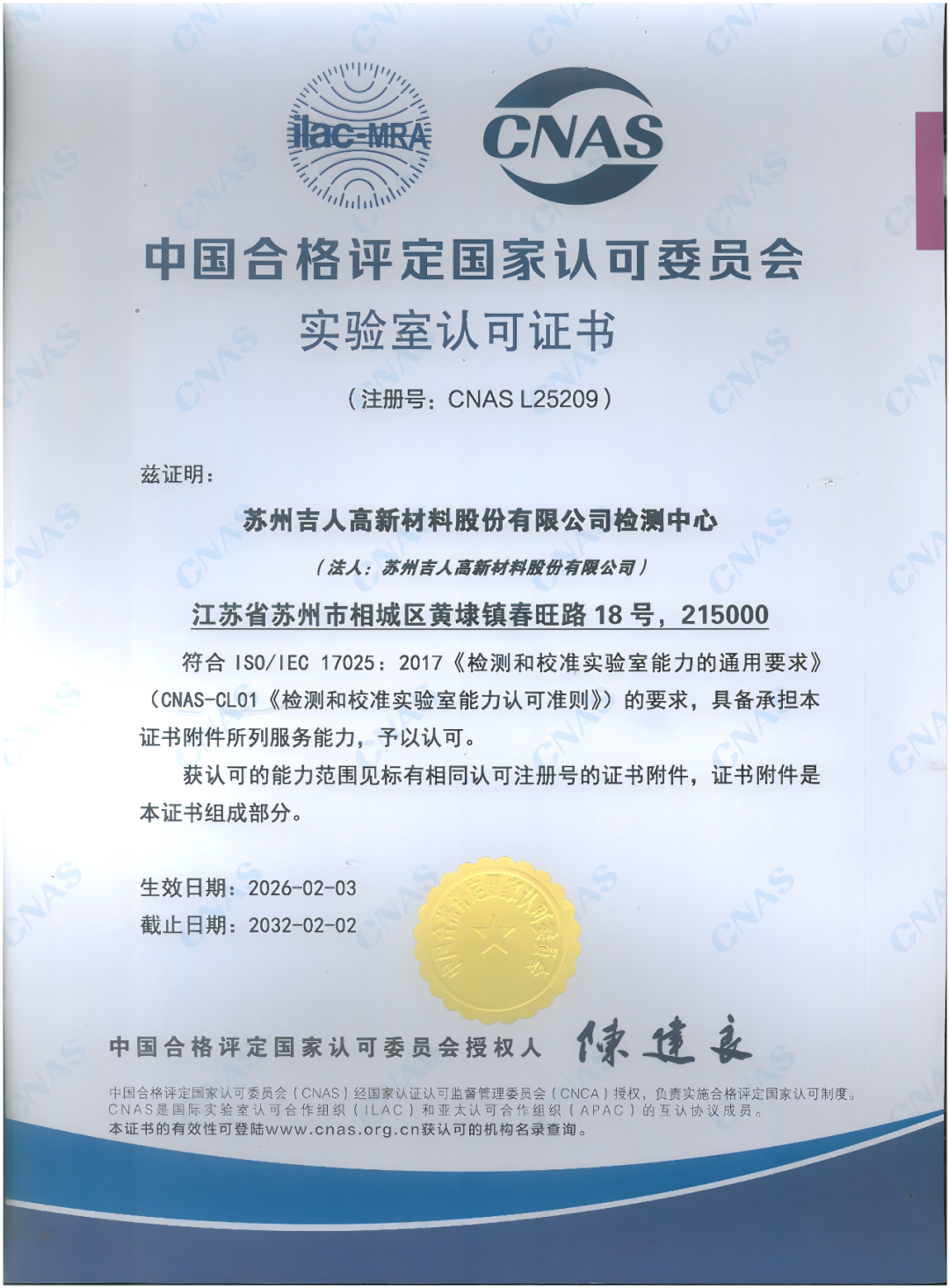 慧正资讯,近日,苏州吉人高新材料股份有限公司(以下简称“吉人高新”)检测中心正式获得中国合格评定国家认可委员会(CNAS)颁发的实验室认可证书(注册号:CNAS L25209),19项核心检测项目全部一次性通过认可。这标志着吉人高新材料检测能力及质量管理体系已达到国家级权威认证标准,具备了按照国际标准开展检测服务的技术实力。